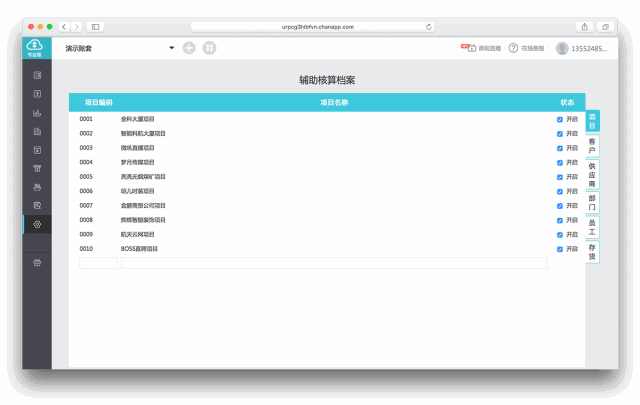 可设置客户、供应商、部门、员工、存货和项目设置编码和名称,每项可以添加9999项内容,辅助核算可中途启用