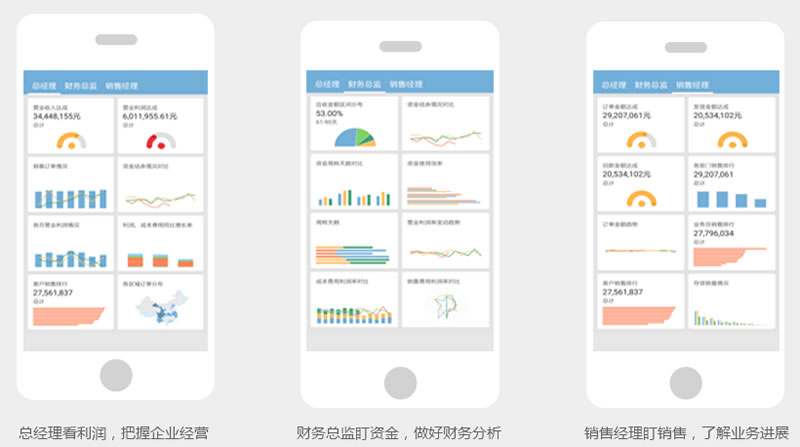 为管理者提供个性化经营数据看板,企业收入、成本费用、利润、资金、回款、盈利能力一目了然